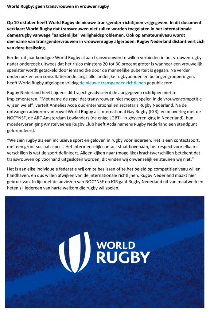 “We see rugby as an inclusief sport and believe that rugby is for everyone. It is a contact sport, with a large social aspect. The interpersonal contact is central, the respect for each other is what defines the sport. Only looking at (possible) physical differences means that transwomen are in advance ruled out. We find this undesirable and don’t support this. “